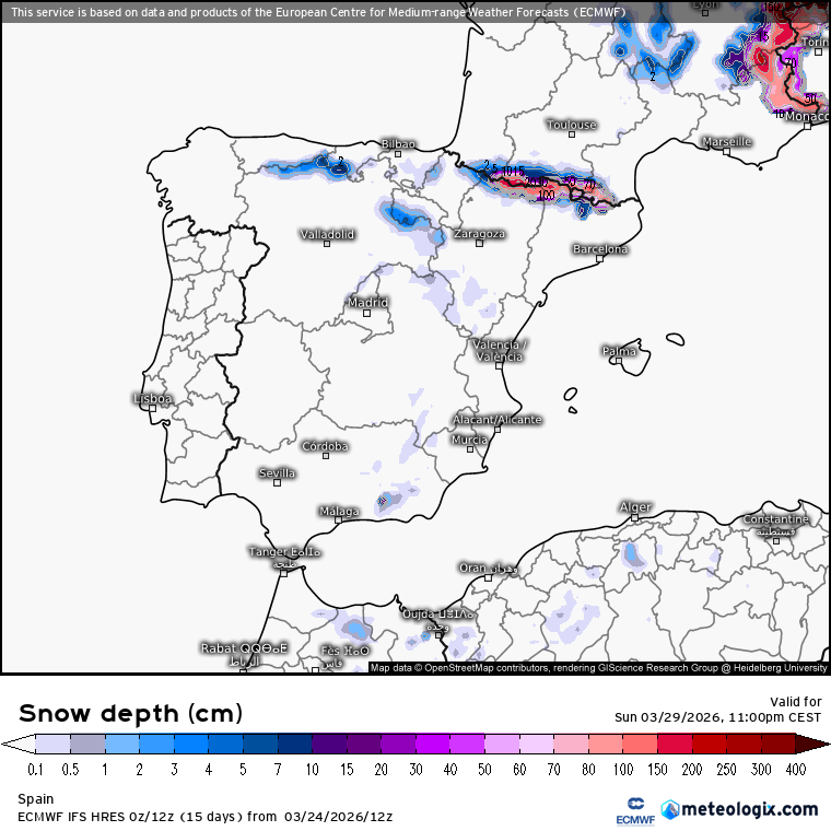 24 de marzo — A 5 días del Domingo de Ramos. Una masa de aire polar desciende sobre la Península desde el miércoles 26, con el pico de frío entre el sábado 28 y el domingo 29 (Domingo de Ramos). La cota de nieve bajará a 600-900 m en el norte peninsular, con acumulados de 40-50 cm de nieve nueva en el Pirineo oscense sobre una base que ya supera los 3 metros en algunas estaciones. Sierra Nevada alcanza los 380 cm. Todas las estaciones principales abiertas con condiciones excepcionales.