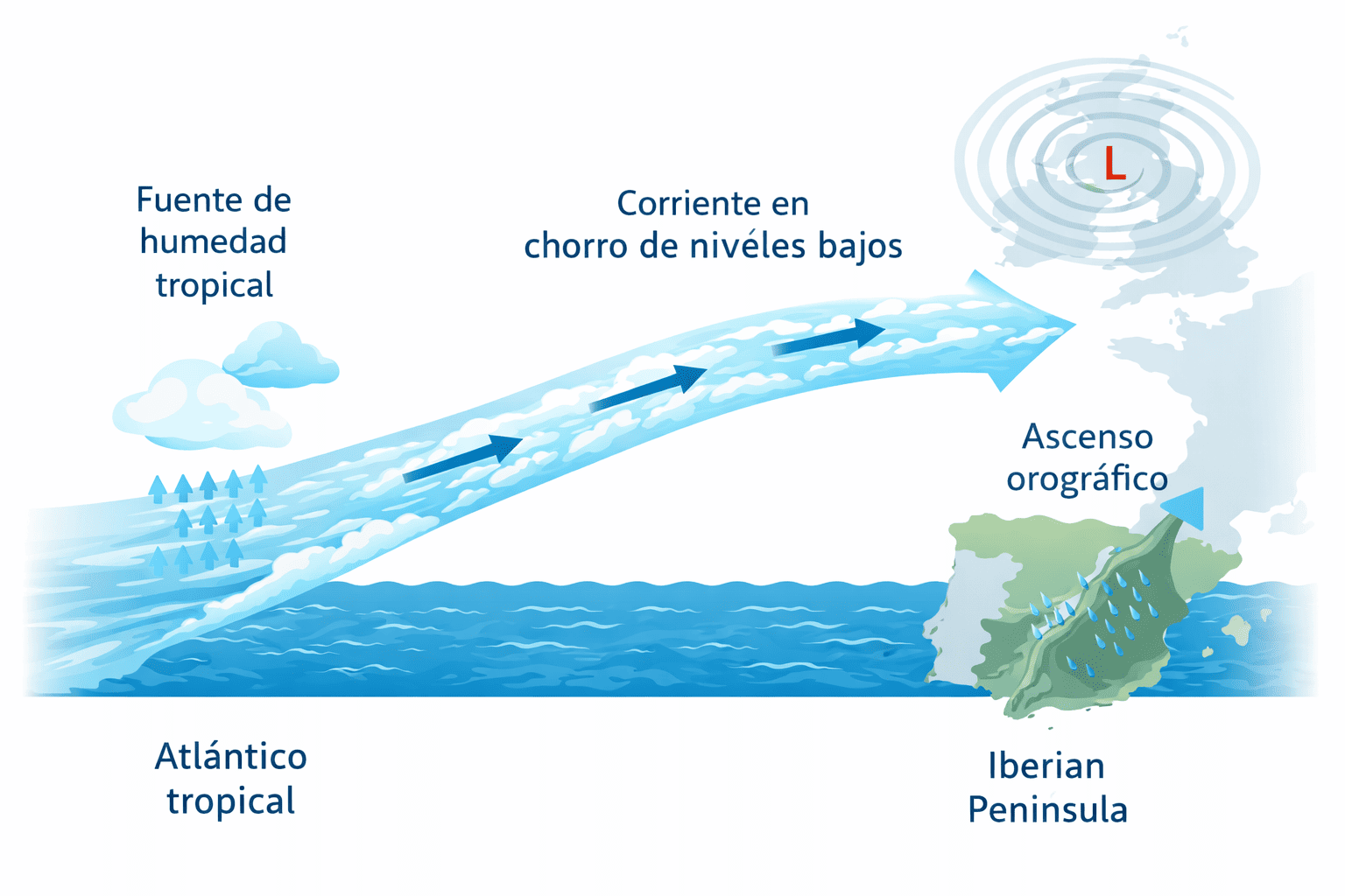 El vapor necesita algo que lo transporte miles de kilómetros. Ese algo es la corriente en chorro de niveles bajos (low-level jet), un flujo de aire rápido y sostenido que circula entre 1.000 y 3.000 metros de altitud. Pensad en el cauce de un río, pero hecho de viento: el aire se canaliza en una banda estrecha, se acelera y arrastra consigo toda la humedad que encuentra a su paso.