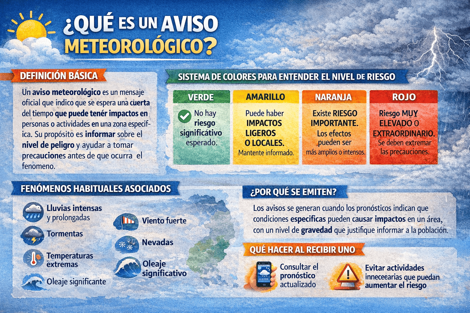 Un aviso meteorológico es una comunicación oficial emitida por un servicio meteorológico nacional (en España, AEMET) que alerta a la población sobre un fenómeno atmosférico que puede suponer riesgo para personas, bienes o actividades.