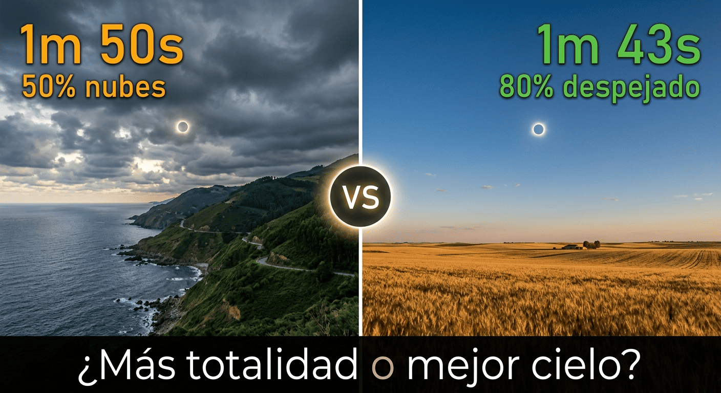 Pensadlo así: si os vais a Luarca (Asturias) tendréis la totalidad más larga de España — 1 minuto y 50 segundos de oscuridad absoluta. Pero estáis en la cornisa cantábrica, donde la nubosidad media en agosto ronda el 50-60%. Una moneda al aire. Puede salir un día espléndido de verano o puede haber una capa de estratocúmulos a 800 metros que os quite la experiencia entera.