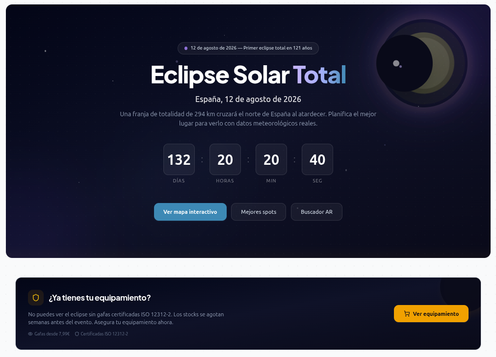 - Dónde ver el eclipse de 2026: los mejores lugares — Análisis detallado de cada zona con meteorología histórica, plan B y opciones desde Madrid, Barcelona y Sevilla.