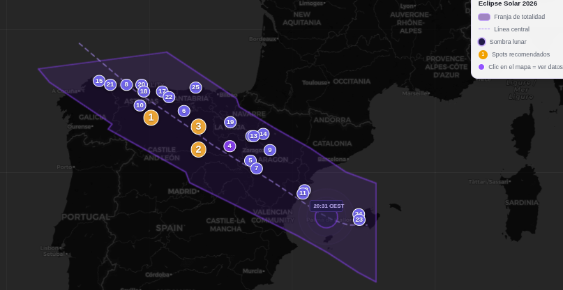 El mapa interactivo muestra la franja de totalidad con la línea central, los límites norte y sur, y los 25 spots del ranking marcados con su puntuación. Pero lo que lo hace diferente es que la sombra lunar se mueve en tiempo real por la línea central, mostrando la hora CEST en cada punto. Hacéis clic en cualquier punto del mapa — dentro o fuera de la franja — y os calcula al instante la duración de la totalidad, la magnitud, la elevación del sol, los horarios de las cuatro fases del contacto y si merece la pena desplazaros o no.