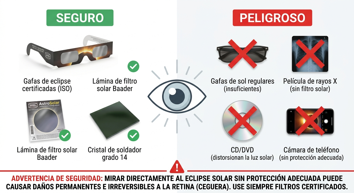 Lo que funciona: gafas de eclipse con certificación ISO 12312-2 (cuestan 2-5 euros, se compran en Amazon), filtro solar Baader AstroSolar ND5 para quien tenga telescopio o prismáticos, y vidrio de soldador grado 14 (no inferior, que no filtra bastante).