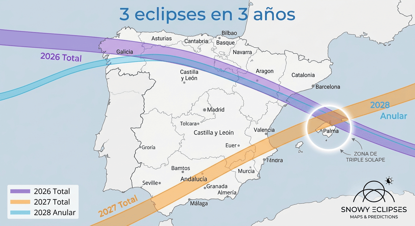 Tres eclipses solares en tres veranos consecutivos. Los sevillanos que se queden fuera en 2026 tendrán la totalidad en su casa en 2027. Y los que cojan el gusto, podrán ver el "anillo de fuego" de 2028. Una oportunidad que no se ha dado nunca en España.