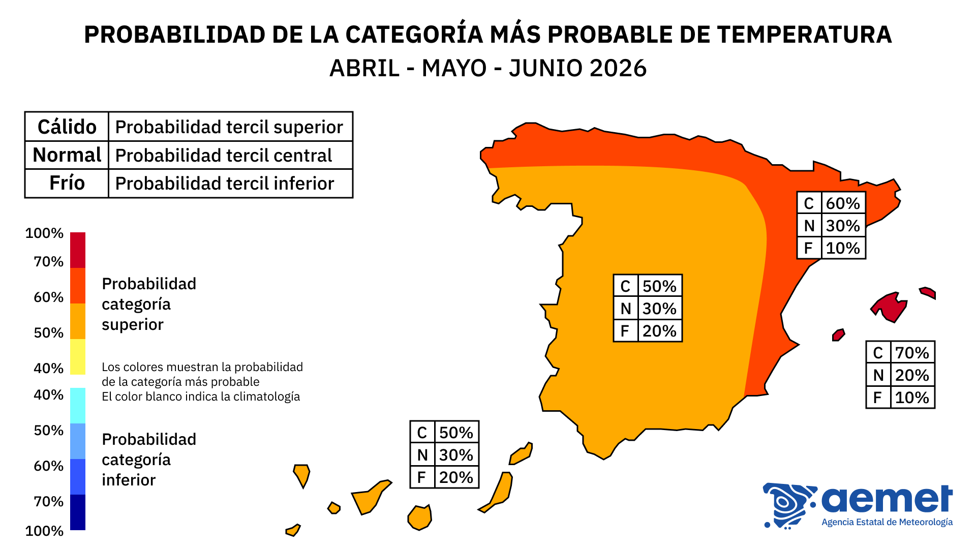 Probabilidad de la categoría más probable de temperatura, AMJ 2026. El puente del 1 de mayo cae dentro de este trimestre. Fuente: AEMET, predicción estacional.