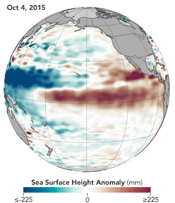 Anomalías de altura del nivel del mar en el Pacífico ecuatorial durante un episodio de El Niño fuerte (octubre 2015), medidas por el satélite Jason-2. Fuente: NASA / Earth Observatory, vía CSU Tropical Forecasting.