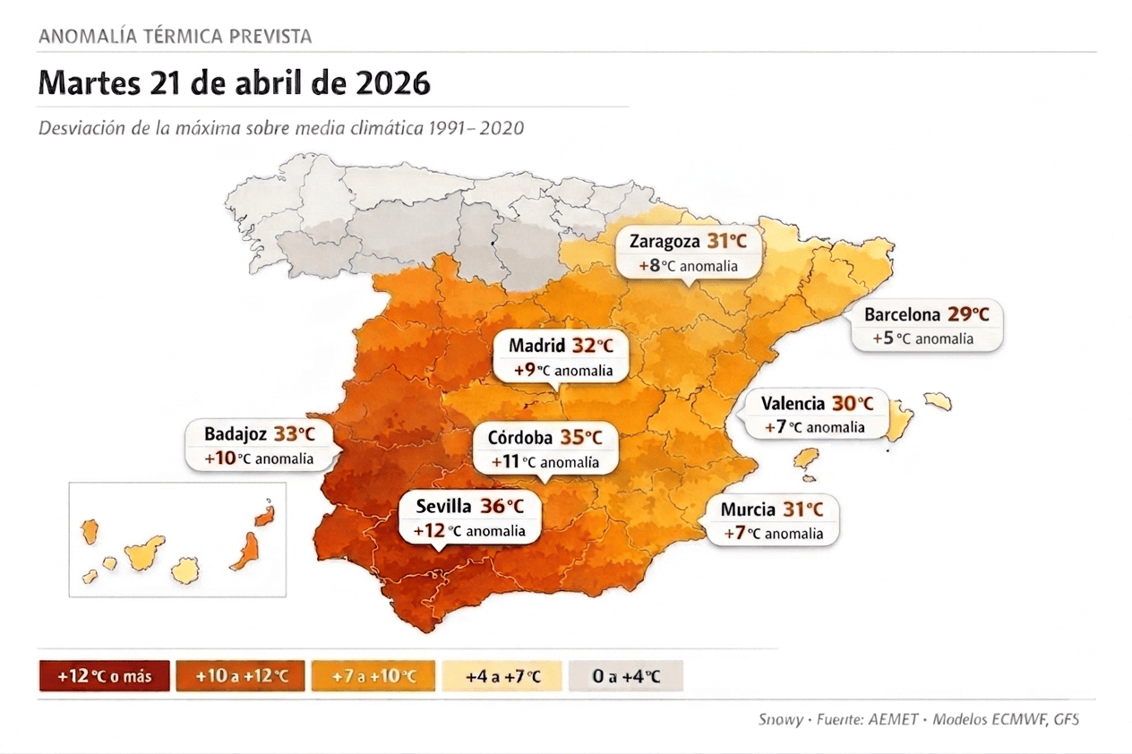 Entre el martes 21 y el jueves 23 de abril, España vive un episodio cálido con anomalías térmicas generalizadas. Los modelos llevan tres pasadas consecutivas consolidando el mismo escenario: una dorsal anticiclónica firme al oeste de la Península, un flujo del sur sobre Iberia y un rango de máximas que en el valle del Guadalquivir alcanza los 36 °C, con anomalías de entre +8 y +12 °C sobre la media climática 1991-2020.